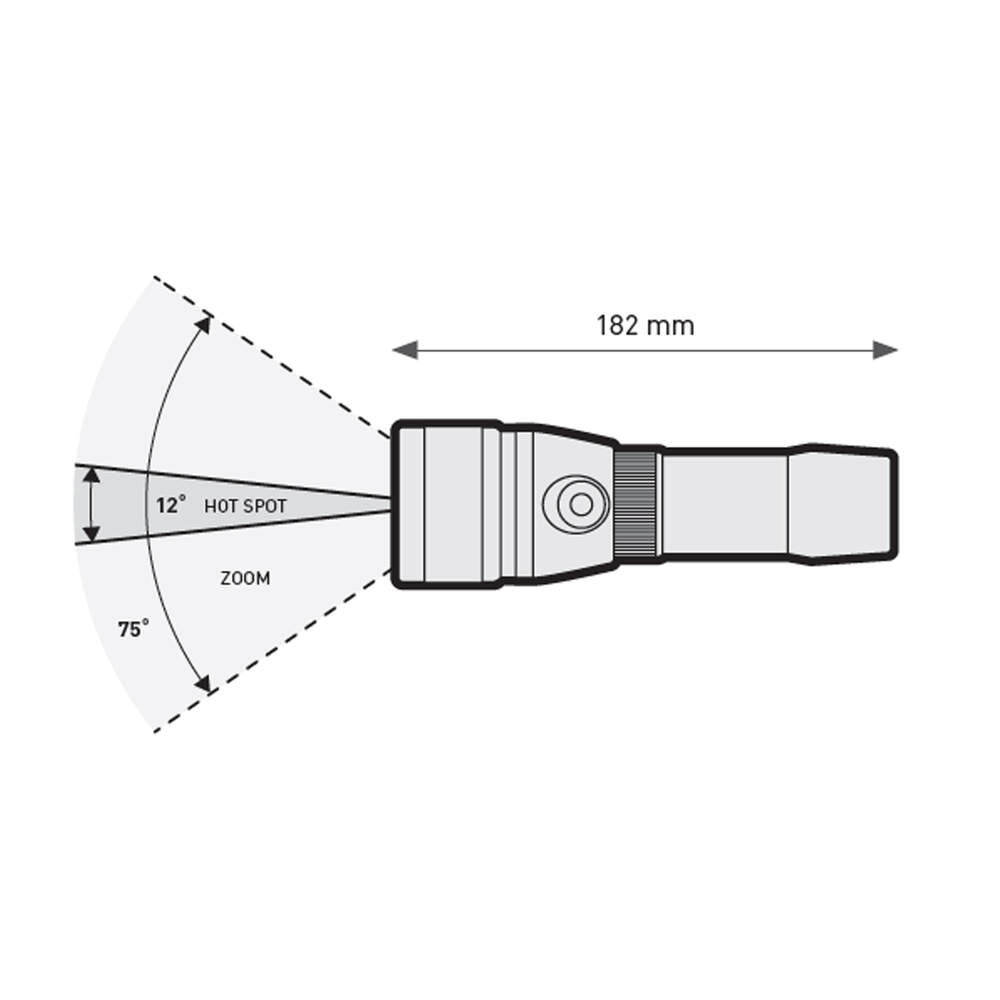 The adjustable light beam is easily controlled by rotating the torch head. A mechanical multifunction switch with a visual battery charge indicator allows you to set four modes: full power, low power (~40%), flashing, and off. The built-in electronic double-push safety feature prevents accidental activation.